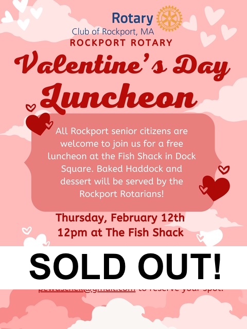 2026 Valentine's Day Lunch Sold Out***** SOLD OUT ***** All Rockport senior citizens are welcome to join us for a free luncheon at the Fish Shack in Dock Square. Baked Haddock and dessert will be served by the Rockport Rotarians. Thursday, February 12, 2026 12pm at The Fish Shack ***** SOLD OUT ***** ![]() |